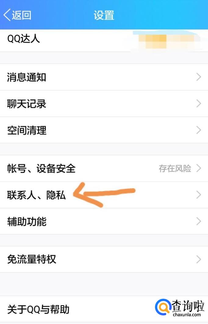 进入设置页后,找到“联系人、隐私”的选项栏,点击一下