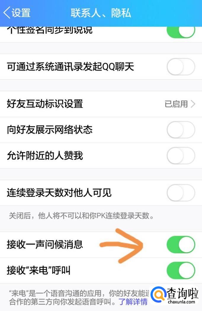 进入“联系人、隐私”后,将页面下拉到底部,看到“接收一声问候消息”的选项,