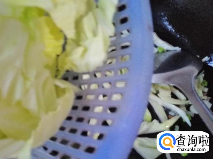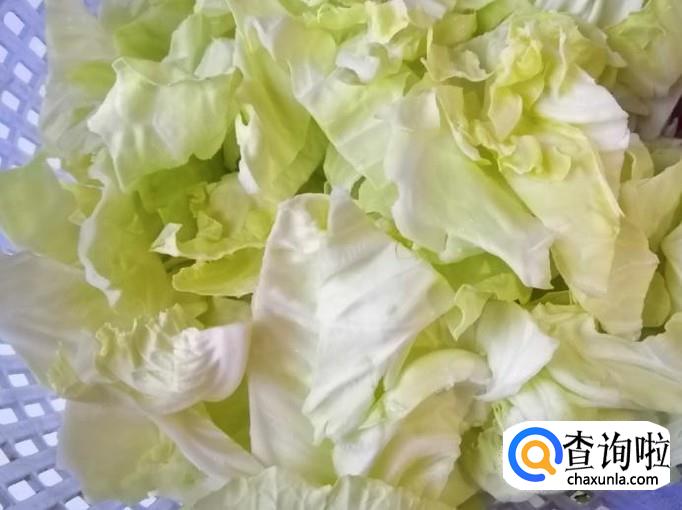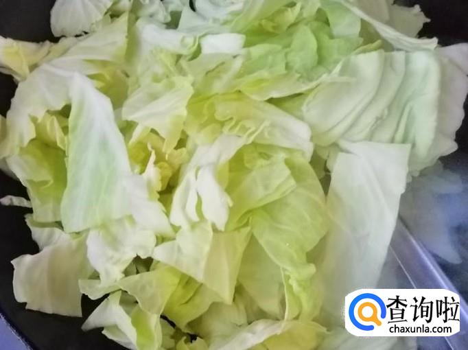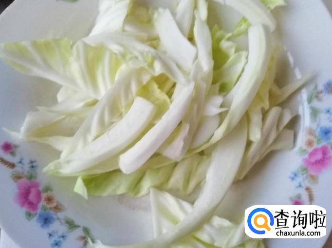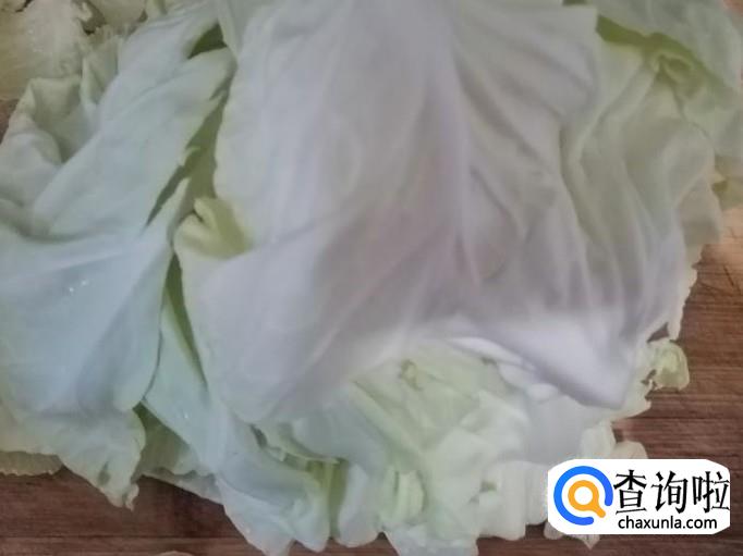 取适量甘蓝,用清水把甘蓝洗净,用盐水泡一会,去掉农药残留,最后再冲洗一遍,把甘蓝硬杆好甘蓝叶子分开,杆切丝,叶子撕成大块待用。