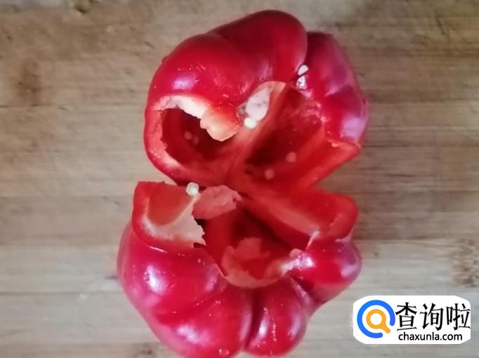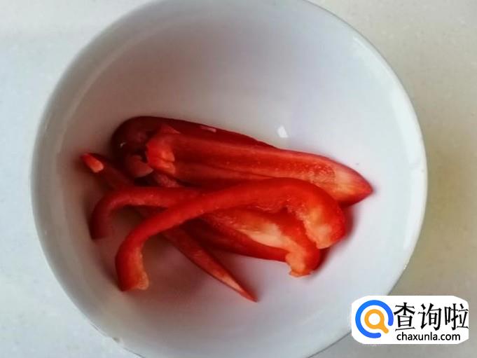 红色菜椒一个,用清水把红色菜椒洗净,去掉菜椒把和菜椒籽,把菜椒切成细丝待用,在这里用量比较少,主要用它做配菜。