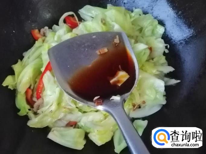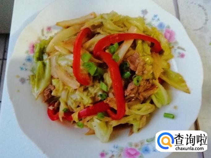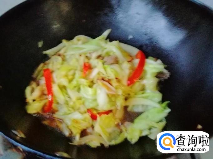 最后加入适量生抽和食盐,关火翻炒均匀,如图所示,我们的醋炝甘蓝炒肉就做好了,最后可以撒点青葱做点缀,这个菜酸、香味比较重,有些微辣,出锅入盘,上桌开吃。