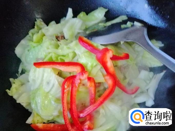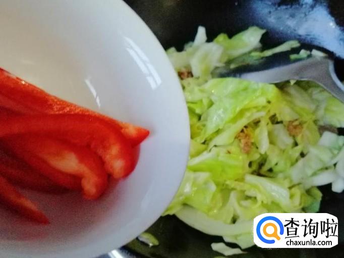接着就可以加入备好的红菜椒丝,继续翻炒均匀,加入一铲子香醋,这样炒出来的甘蓝清脆爽口。