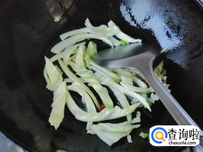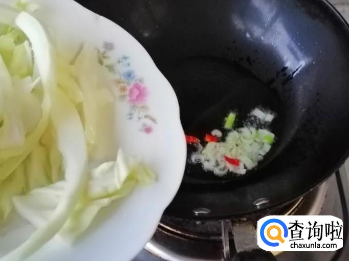炒锅放油,油热后先放葱花和干辣椒炝锅,炒出香味后,加入切好的甘蓝丝,用铲子快速翻炒均匀,然后再加入备好的甘蓝叶子。