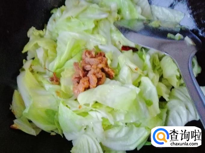 因为甘蓝杆比较硬,早下锅翻炒会,到时候就能和甘蓝叶一起熟了,加入适量熟猪肉,用铲子翻炒均匀。