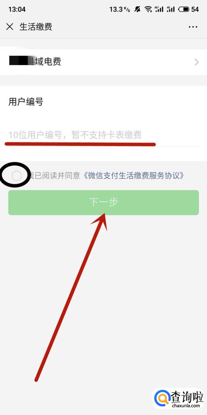 选好之后,输入用户编号,同意服务协议,点击“下一步”,如图所示。