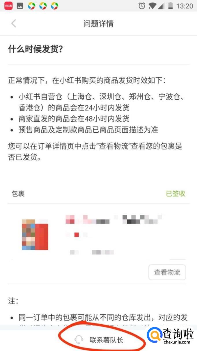 进入后,下滑到最下方,有“联系薯队长”,点击进入,选择订单,询问客服即可