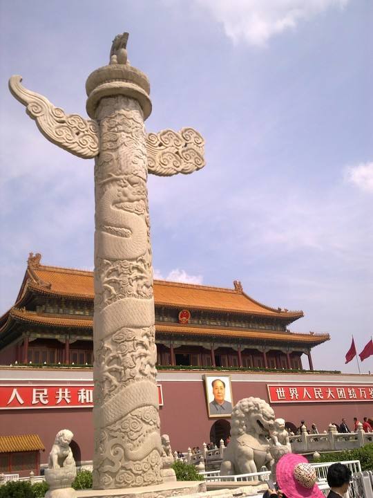 天安门前的这对华表上的蹲兽,头向宫外;天安门后的那对华表,蹲兽的头则朝向宫内。