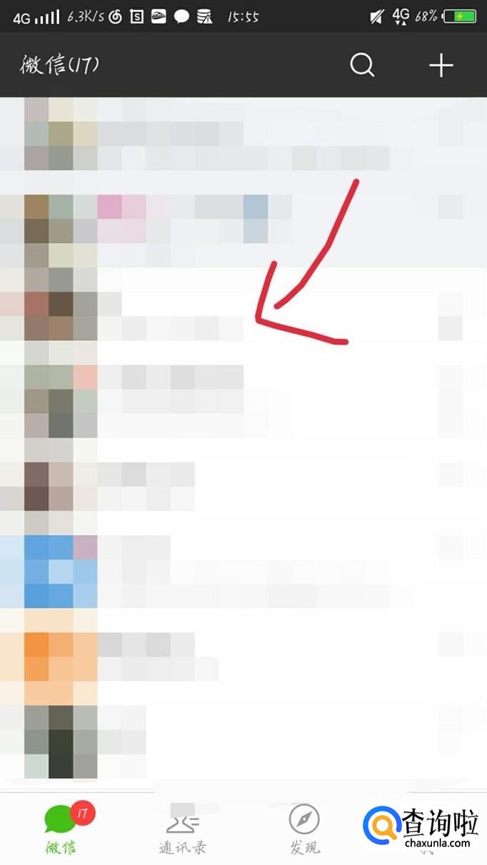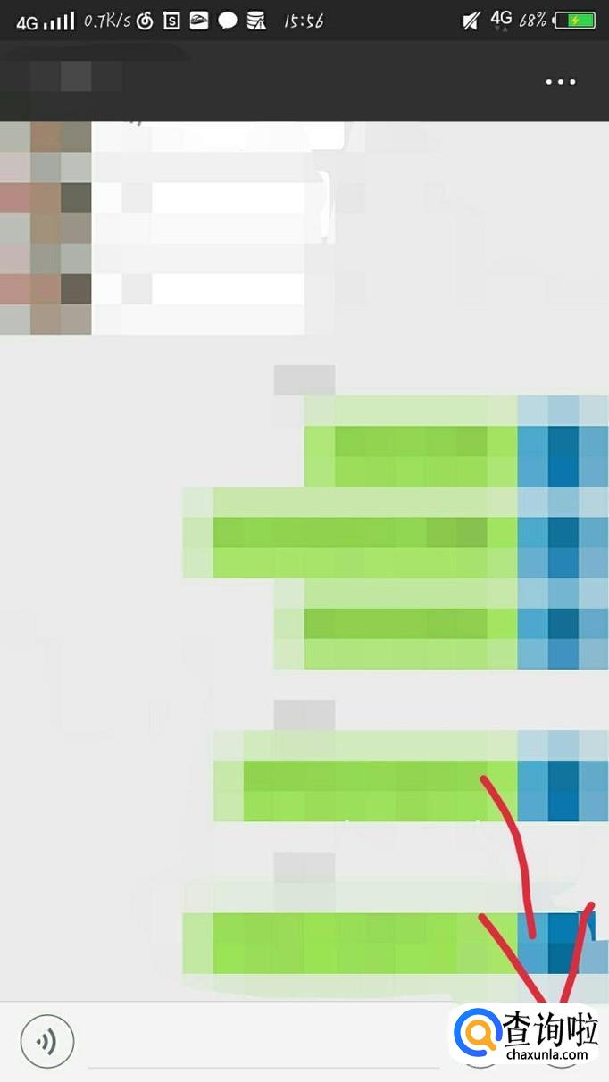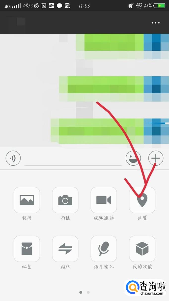 选择一个你想知道位置的联系人,如图1箭头所示。就会进入与他的聊天界面,如图2所示。
