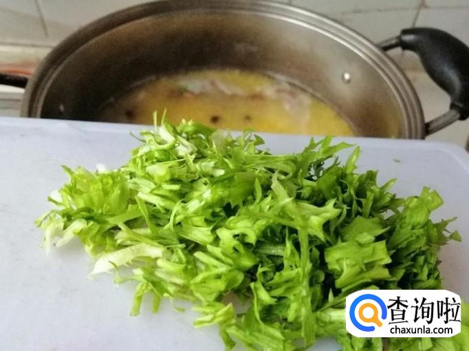 稍煮片刻后,加入备好的苦菊叶子,用勺子轻轻搅动,大火煮开五分钟后,改中小火煮。