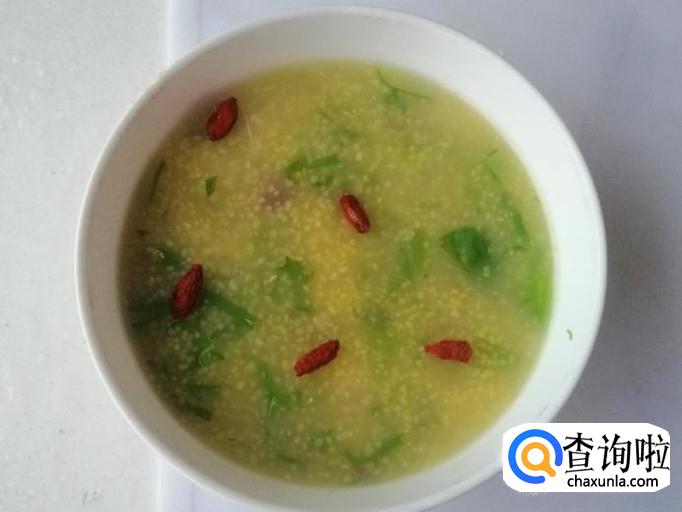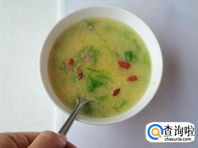 如图所示苦菊豆子玉米渣粥就做好了,把做好的粥盛入碗中,稍晾片刻,还可以加几粒枸杞做点缀,好喝又营养。