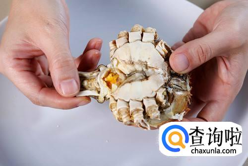 第一步:首先将螃蟹的肚脐掰下来。