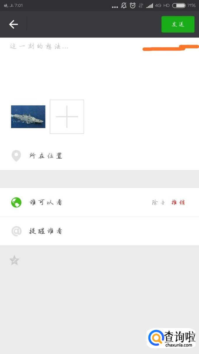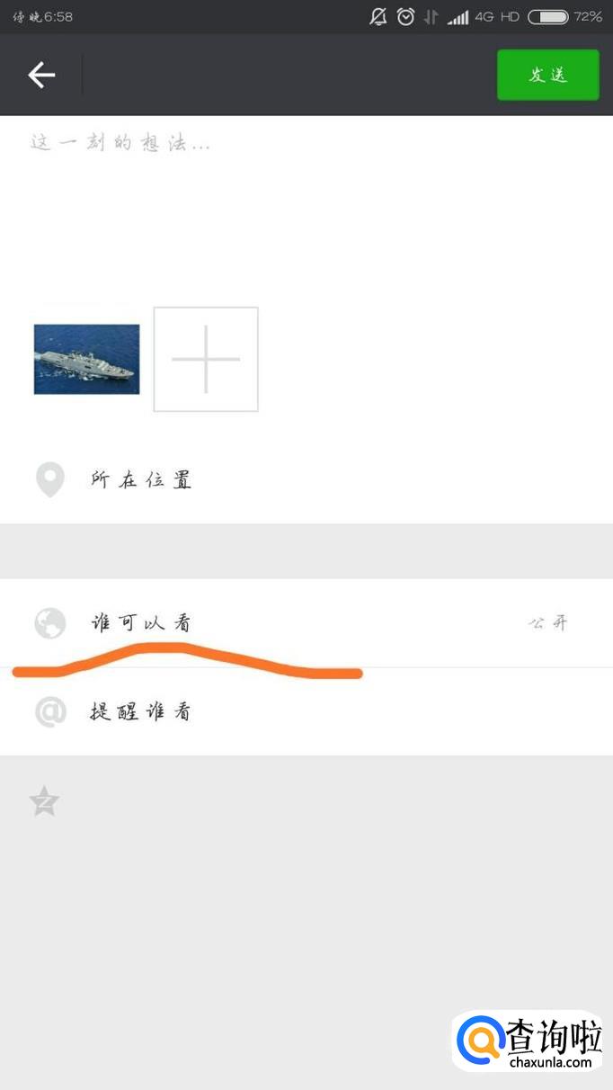 编辑朋友圈内容,然后点击“谁可以看朋友圈”