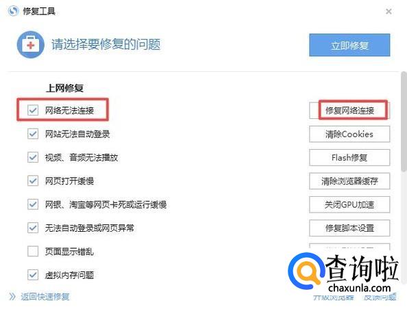 然后我们点击勾选上网络无法连接,之后我们点击修复网络连接,这样就可以了。