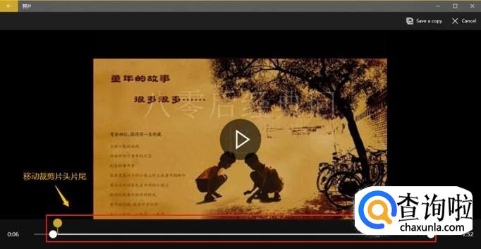 此时刚才视频播放界面的进度条处就变成了以下的样子,我们通过移动进度条的位置来达到过滤片头片尾的目的,最后裁剪完成以后点击"Save a copy",将这段视频保存到我们指定的位置,再次打开查看就会发现没有片头和片尾了