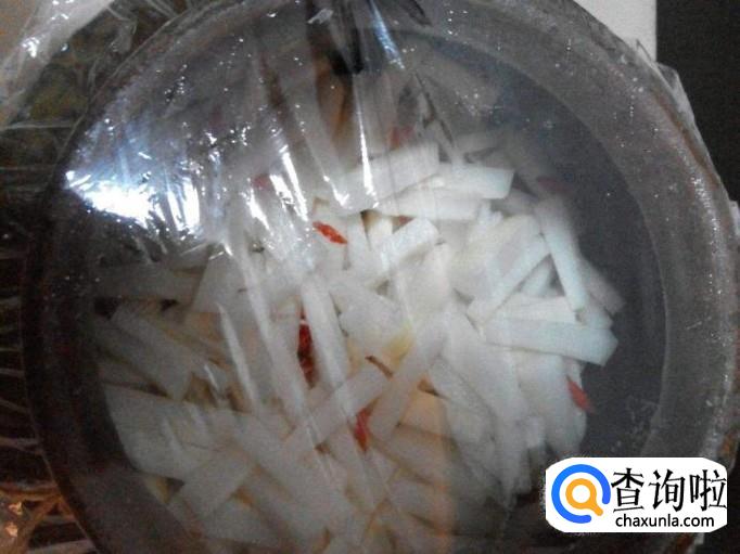 然后把萝卜条放入容器中,然后用保鲜膜密封容器口,倒入冰箱冷藏室进行冷藏