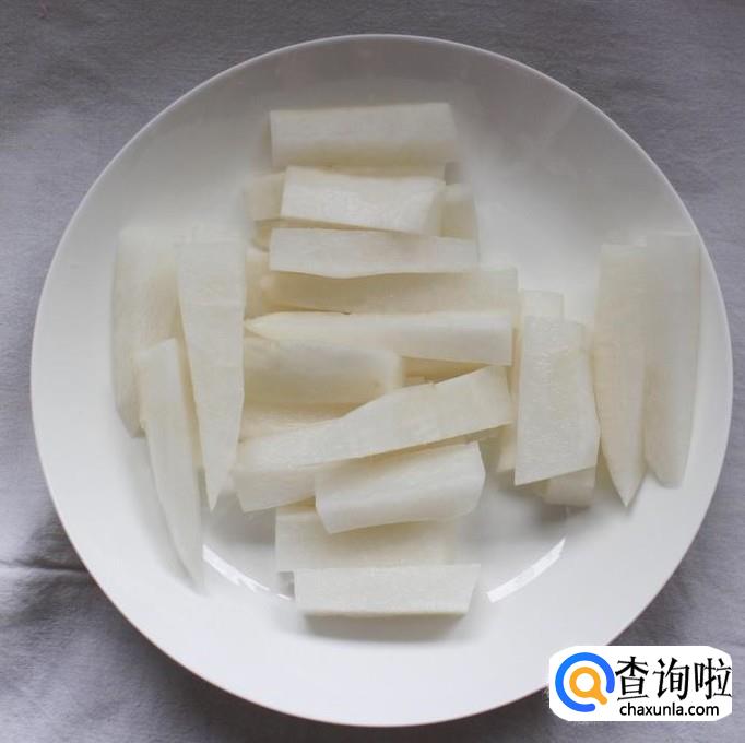 首先我们把白萝卜洗净表皮,然后用刀切成粗细均等的条状,然后均匀的撒上适量的盐腌制半天左右