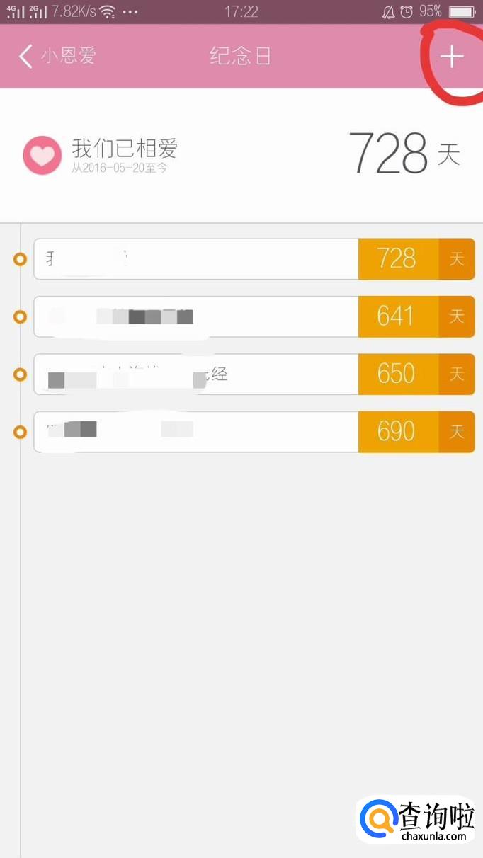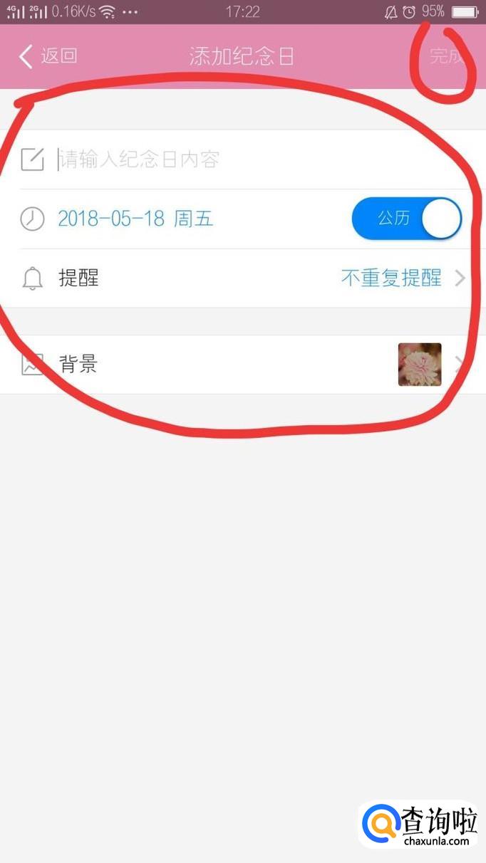 点击纪念日右上角的“+”添加纪念日,然后输入纪念日的内容,选择好日期,也可以设置纪念日的背景,基本信息填完之后点击完成。