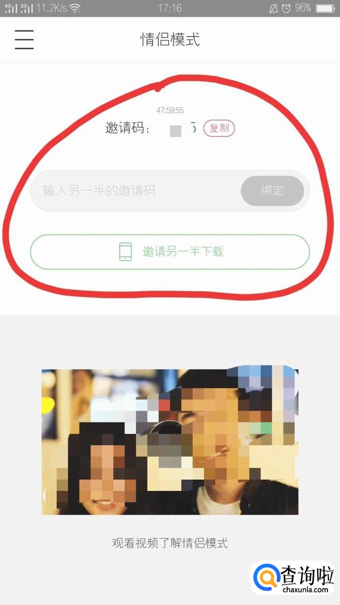 注册成功之后,就会自动跳转到情侣模式,生成了一个邀请码,然后你邀请另一半输入邀请码就完成情侣配对了。