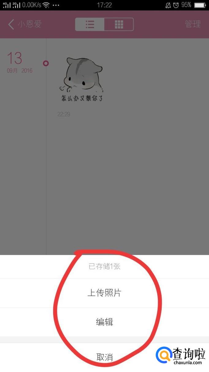 在图片页面中,我们可以上传与情侣之间互动照片。点击右上角的管理,找到上传图片,就可以上传照片了。