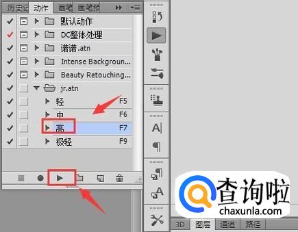 点击动作选项在动作面板里选择我们的磨皮动作,然后找到播放按钮,如图所示: