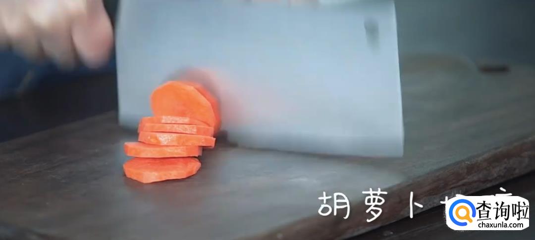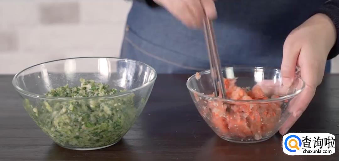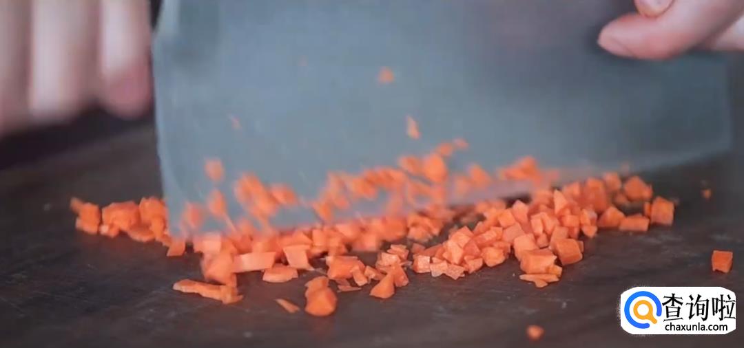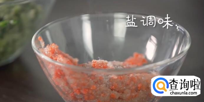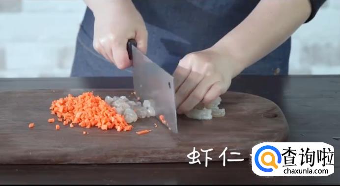 胡萝卜剁碎,将虾仁切块,再将虾仁和胡萝卜混在一起剁成肉馅。