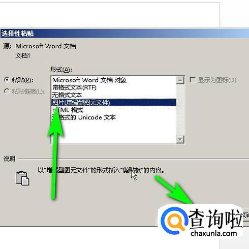 按下快捷键:ALT+CTRL+V;调出选择性粘贴的对话框;弹出对话框,选择图片再点确定;如图所示。
