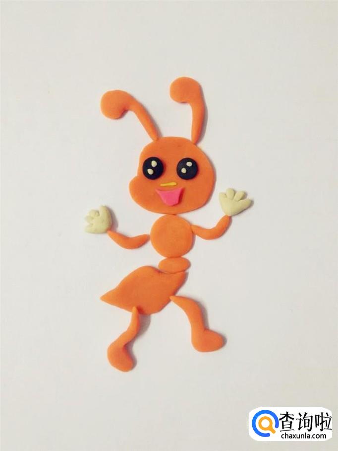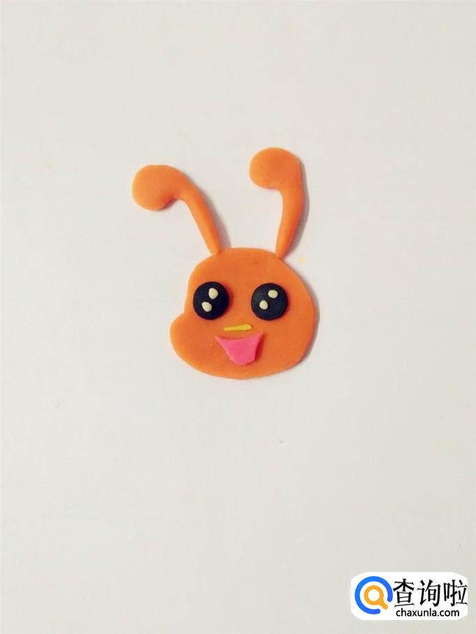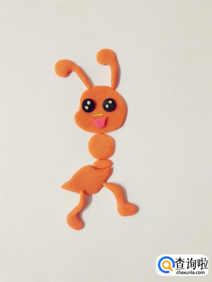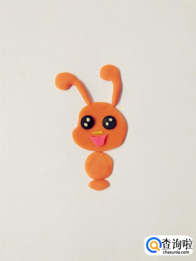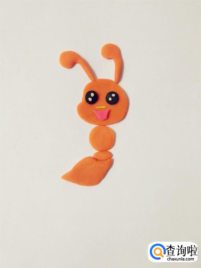 用两块桔色捏成两个逗号的形状,粘在小蚂蚁的头顶,当作触角。
