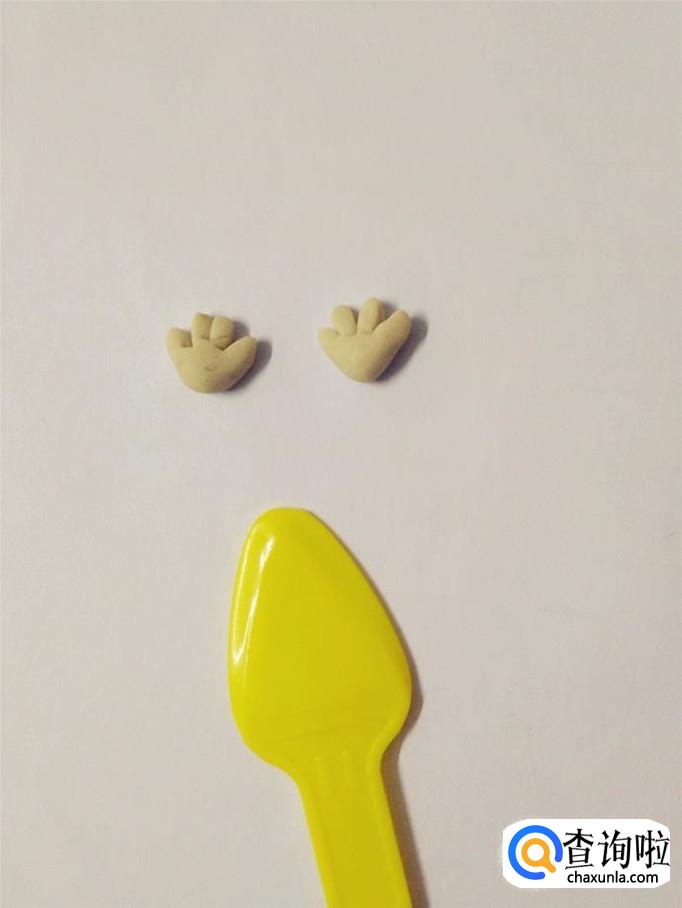 再用两块白色,捏成贝壳的形状,用小刀在每个白块上切三刀,分出四个小手指来。