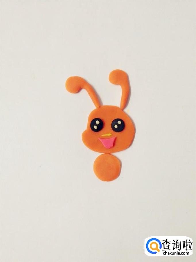 用桔色团一个圆球,按成扁片,粘在小蚂蚁的头下,当作胸部的那一节。
