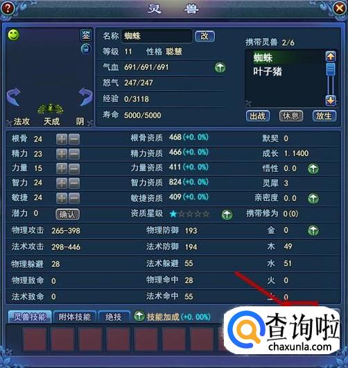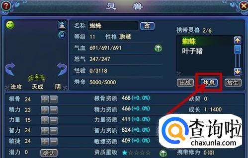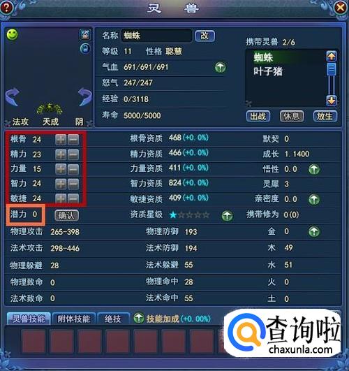 灵兽升级可以获得潜力点,潜力点可以分配到图示红框中的五种能力中,分配后灵兽的攻击,防御等属性会提高。