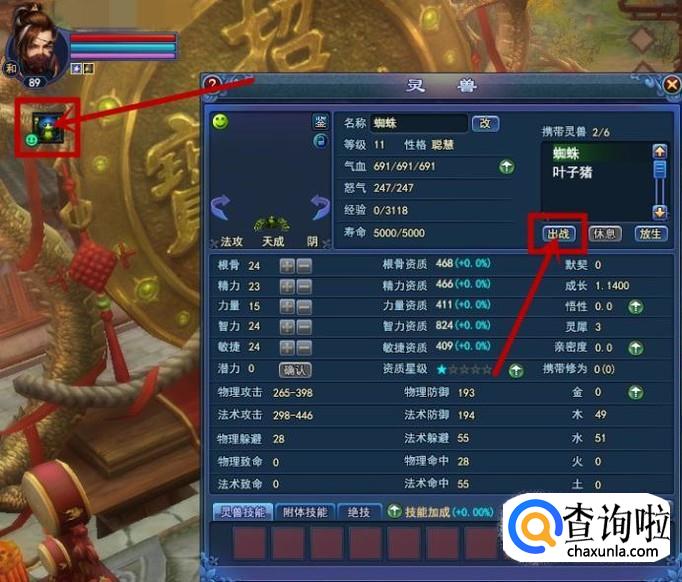 当拥有灵兽时,点击左上角灵兽头像或打开灵兽面板,选择需要出战的灵兽,点击右上边的出战,即可让灵兽参加战斗。