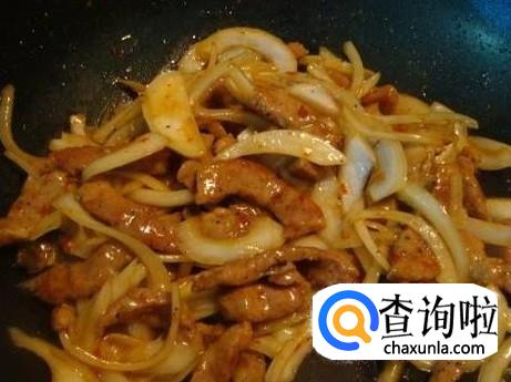 肉片炒至八分熟时,将洋葱倒入锅中,翻炒均匀,加入少许白糖,可以去掉洋葱的辣味,等洋葱炒至半透明状时,这时候洋葱的味道是最好的,就可以出锅了。