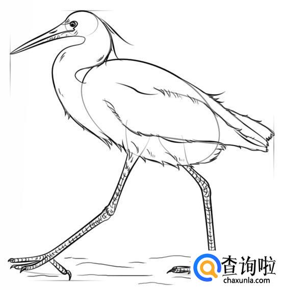 增加一些羽毛的细节,腿上画出纹路就可以了。这样一只白鹭就画好了。