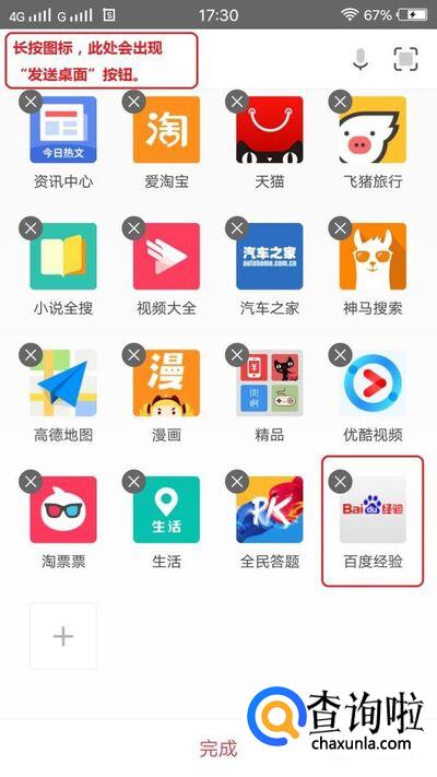 此时,在UC浏览器“首页”中有了“百度经验”的图标,长按该图标,在页面左上角会出现“发送桌面”选项, 把该图标拖动到该选项上就发送成功了,最后桌面效果如下图。