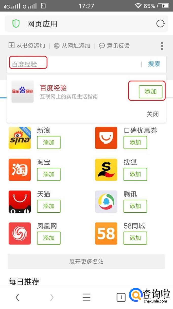 进入“网页应用”界面,在搜索栏里输入“百度经验”,出现如图所示的提示,我们点击“添加”。