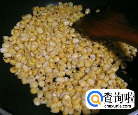 将蒜片,玉米粒倒进去,不断的翻炒,不一会儿,玉米粒就会一颗颗都变得鼓起来,这时,玉米粒就炒熟了。