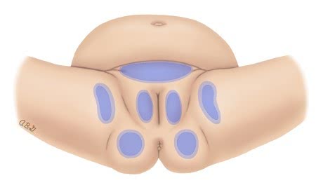 “红屁股”多数是指尿布疹或尿布皮炎,是婴幼儿最常见的皮肤疹。为什么会发生呢?宝宝皮肤十分娇嫩,当每日排便排尿的次数比较多,粪便尿液中的氨水等刺激性物质经常刺激皮肤,所以,它通常发生在与尿布直接接触的凸起皮肤表面,包括臀部、下腹、生殖器和大腿等部位。(如图所示蓝色为常发生“红屁屁”的位置)