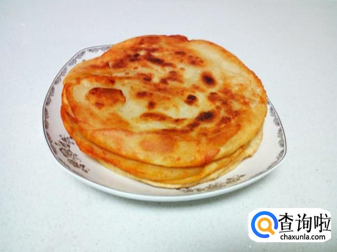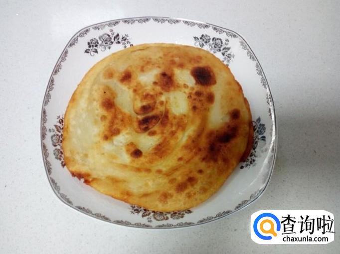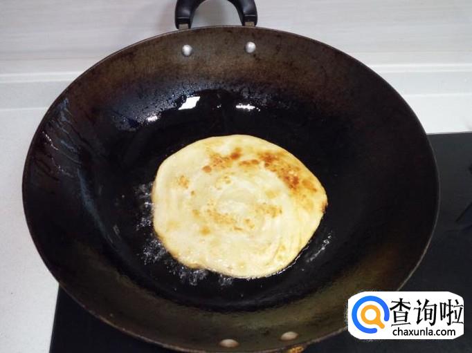 面饼定型后(大概四~五秒钟的时间),翻面煎塌。翻面煎塌至四,五秒钟后,再翻面煎塌(总共翻三次面煎塌,每次四,五秒钟时间),然后盛出。继续煎塌下一个饼的时候,如果感觉油少,就再放入一些油。