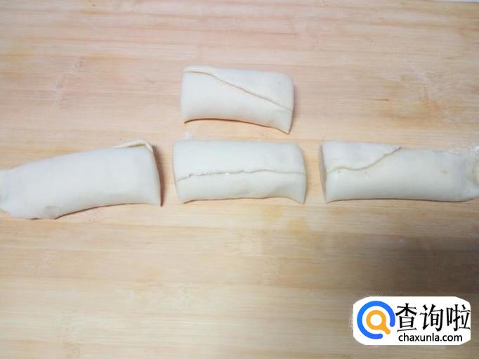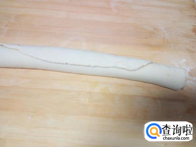 然后把面片卷成圆条状,用刀分割成段(每段10公分左右长)。