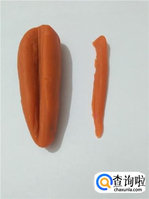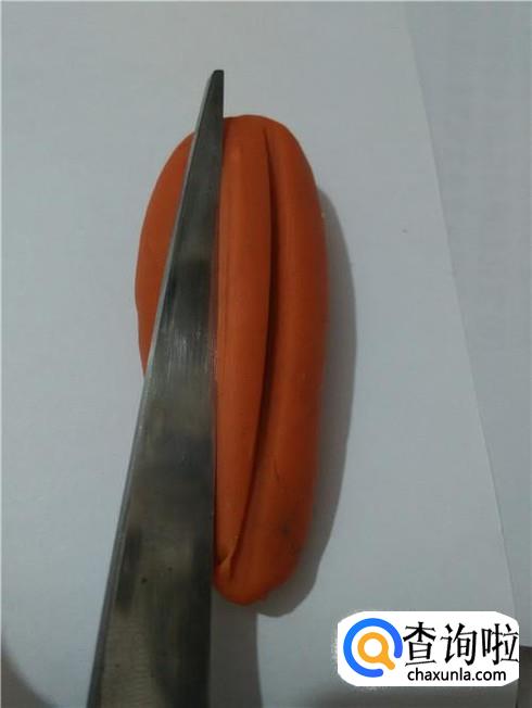 用刀在胡萝卜侧面斜着向左切一刀,再呈45度夹角向右切一刀,切出一个长长的条,用同样的方法,把胡萝卜一周共切掉四条或更多的条。