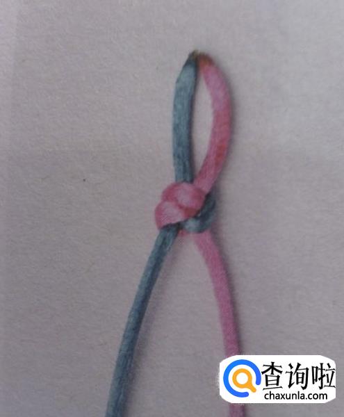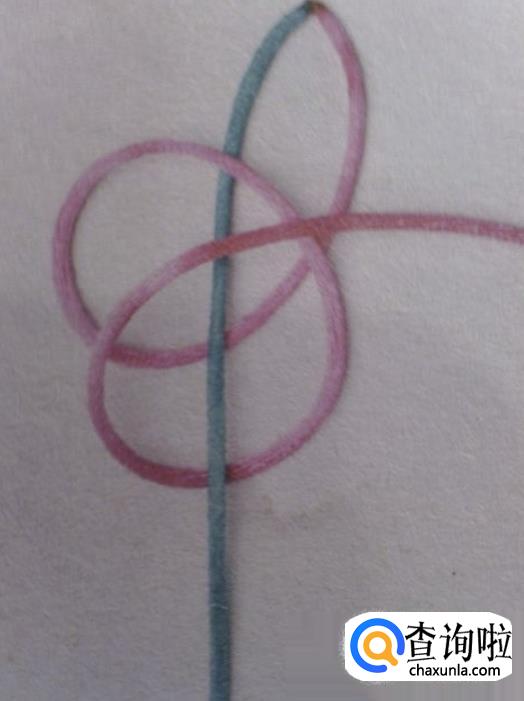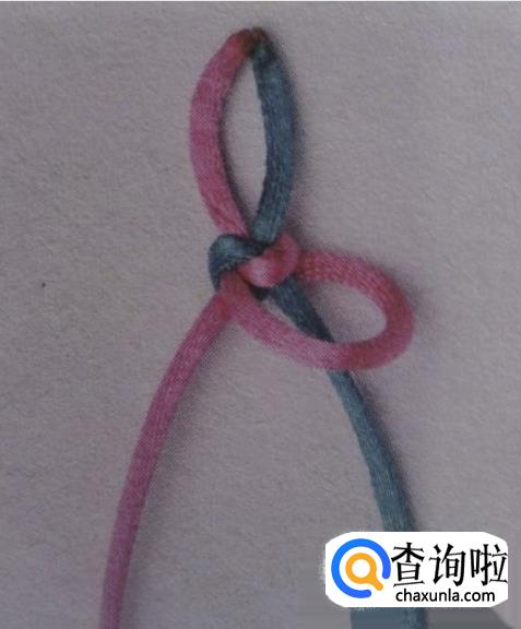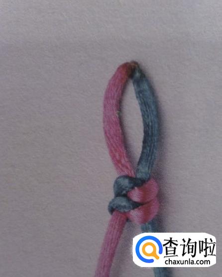 蓝线从粉线下方绕过,再穿入粉线抽出圈中,最后将线拉紧。第二个结完成。