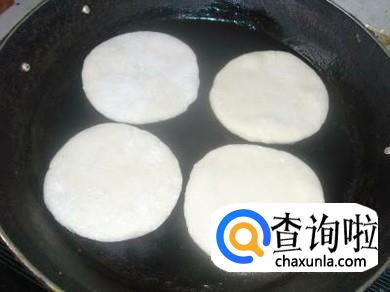 将小饼放入锅中,进行煎制。