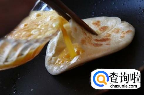 煎至面饼上面皮气泡之时,用筷子或铲子将其挑开一个小口,然后,将鸡蛋液灌入,将面饼的口盖好。