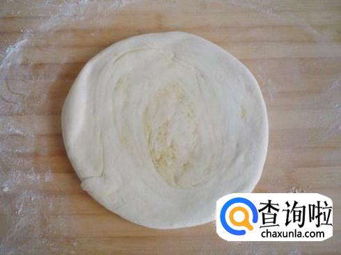 将发好的面团切成面块,不停揉搓,抹上适量的油、葱花、盐。然后将其卷起来,再按压成小饼。
