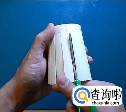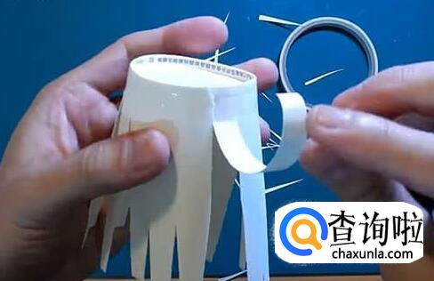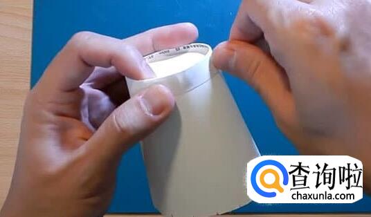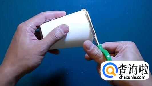 然后从杯口向杯底剪开,剪到双面胶的边沿为止。