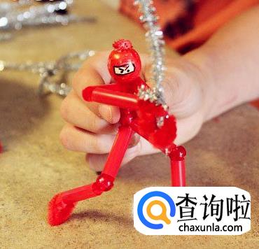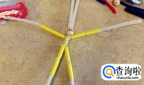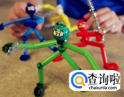 然后用毛绒的材质在各个吸管头填充,形成手脚的状态。吸管和毛根手工制作的简单忍者就做好了。