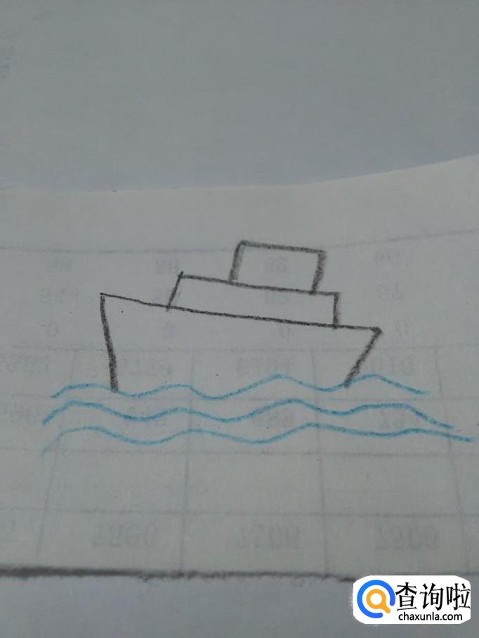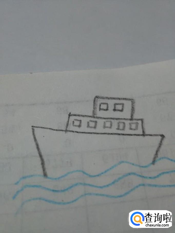 在梯形上面,画两个长方形,表示轮船上的房子。