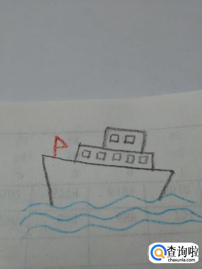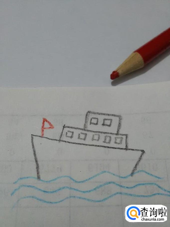 在船头画一条竖线,表示旗杆,在旗杆的顶端,画一个三角形,表示红旗,到这里,轮船就画完了。