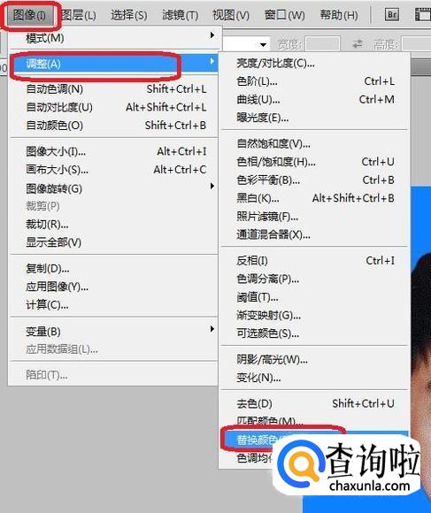 如图所示,点击“图像”,“调整”,“替换颜色”,出现“替换颜色”选项框。