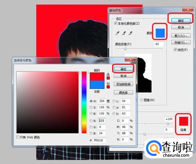 出现选项框后,光标变成滴管形状,点击一下照片中需要替换颜色的底色区域(蓝色区),然后如图所示,点击选项框下方替换区图标,选择目标颜色,我们选择红色,点击确定。
